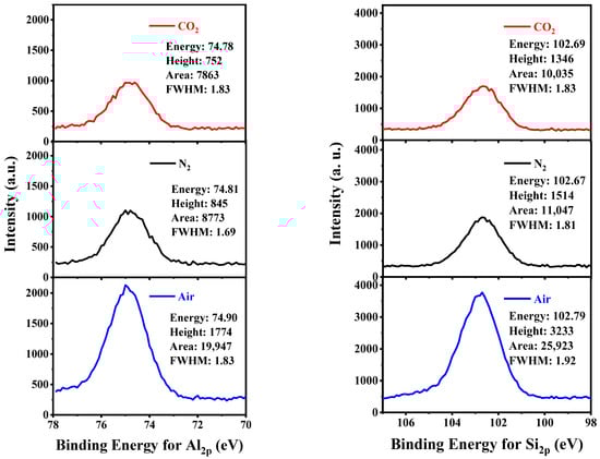 The detailed region scans of Al 2p and Si 2p of KAS calcined at 700 °C under different atmospheres are summarized in Figure 11. The binding energies for the Al 2p and Si 2p peaks did not change significantly when calcined under different atmospheres. However, a distinct variation in peak area indicated that a change in chemical structure might occur. It is well-known that the peak area of spectra for an atom relates to the fractional composition of this atom, and thus the atomic ratios of Si to Al can be calculated by the aid of the atomic sensitivity factors (ASF (Al 2p) = 0.185 and ASF (Si 2p) = 0.270) (Table 5) [7]. It can be seen that the peak area for KAS calcined under air showed a different changing pattern from KAS calcined under N2 and CO2. Compared with raw KAS, the peak areas of both Al 2p and Si 2p calcined under air nearly doubled, while the peak areas calcined under N2 and CO2 slightly decreased. The detected atomic ratio of Si to Al in the raw KAS was 1.2, which showed small deviations from the bulk atomic ratio of Si to Al, determined from the XRF analysis, implying that the KAS was well-distributed. Furthermore, few variations in the atomic ratio of Si to Al could be observed after the KAS calcined in different atmospheres. Therefore, the significant increase in the peak area of Al 2p and Si 2p calcined under air might be the result of the burning out of carbon on the surface of KAS.