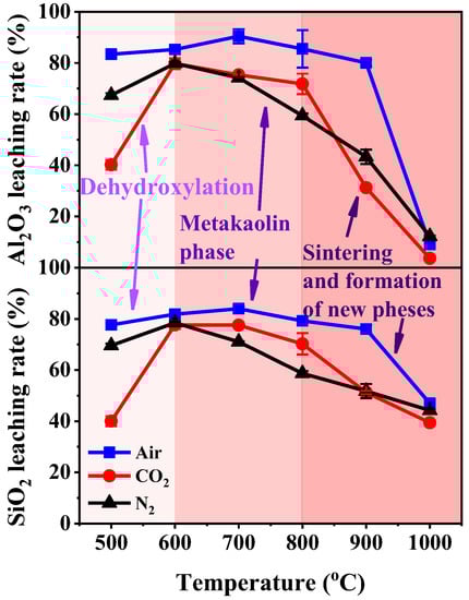 Apart from the structural transformation of kaolinite, the carbon content in the KAS also affects chemical reactivity. Before 600 °C, the accelerated transformation of kaolinite caused by combustion of carbon in the KAS resulted in the higher leaching rates of the calcinated samples than the KAS samples under air than those under other atmospheres. Beyond 600 °C, although the complete transition of kaolinite to metakaolinite occurred under each atmosphere, the leaching rates of calcinated KAS under air were still higher than those under inert atmospheres. This was because when the KAS calcinated under inert atmospheres, the carbon only pyrolyzed to form semi-coke. The existence of semi-coke increased the resistance of mass transfer and solid–liquid separation in the leaching reaction, thereby decreasing the leaching rate [6].