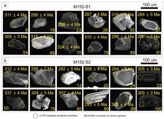 Zircon grains from M152-S1 and M152-S2 are euhedral crystals, with clear concentric oscillatory zonings, indicating a magmatic genesis (Figure 5) [41,42]. A total of 89 and 98 effective detrital zircon U-Pb dates from sample M152-S1 and M152-S2 were obtained (Table S1). Considering these U-Pb ages were younger than 1000 Ma, 206Pb/238U ages were chosen.