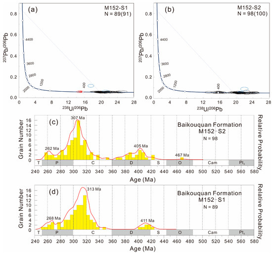 (2) M152-S1 yielded U-Pb ages ranging from 417 Ma to 253 Ma, with a dominant age peak at 313 Ma and two secondary age peaks at 411 Ma and 268 Ma, while M152-S2 yielded U-Pb ages ranging from 467 Ma to 256 Ma, with a dominant age peak at 307 Ma and two secondary date peaks at 405 Ma and 262 Ma.