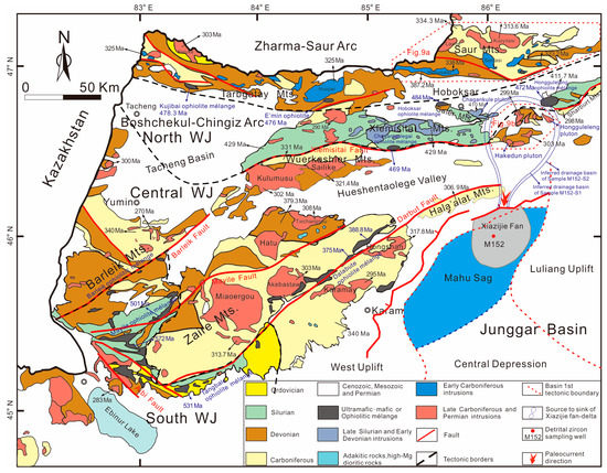 However, Early Carboniferous intrusions rather than Late Carboniferous intrusions widely developed in the Zharma–Saur arc (Figure 7 and Figure 8a), indicating this arc is not the main provenance area for this sample. The Boshchekul–Chingiz arc contained a large area of the Late Silurian to Early Devonian magmatic rocks and locally distributed Late Carboniferous to Early Permian post-collision magmatic rocks (Figure 7 and Figure 8b), indicating Boshchekul–Chingiz arc also was not the main provenance area. The south West Junggar domain contained many Late Carboniferous to Early Permian post-collision magmatic rocks in the Alashankou area (Figure 7), but it can also be excluded by the following factors: (1) the Alashankou area is located hundred kilometers to the southwest of the Xiazijie area, which contradicts the short-distance transportation nature of fan-delta deposit and the paleocurrent direction from north to south reconstructed by heavy minerals ZTR index, formation dip logging and the conglomerate thickness/formation thickness ratio [3,4]; (2) Cambrian ophiolite mélanges, such as Mayile ophiolite mélange and Tangbale ophiolite mélange, are widely distributed in the whole south West Junggar domain (Figure 7), but the zircon U-Pb ages more than 480 Ma were absent in this sample (Figure 8f).