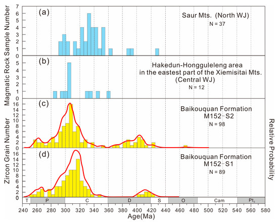 In order to confine the concrete position of the source area, the crystallization ages of magmatic rocks from Saur arc and Hakedun–Hongguleleng region in the east margin of Xiemisitai mountain were compiled (Figure 7 and Figure 9a,b), considering these two regions are located to the north of the Xiazijie fan-delta and Late Carboniferous to Early Permian post-collision magmatic rocks were widely distributed in both of them (Figure 7).
