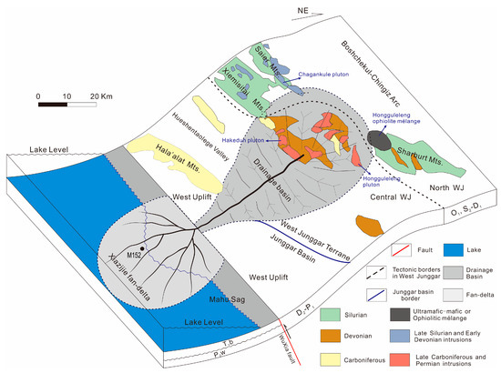 Based on the source area analysis in this paper and sedimentary studies of Xiazijie fan-delta by other scholars [2,3,4], a simplified source to sink system of Xiazijie fan-delta was reconstructed (Figure 10). The drainage basin was bordered by the Hongguleleng ophiolite mélange in the Sharburt mountain on the northeast and Chagankule pluton in the Saier Mountain on the west, with a long axis of about 75 km and a short axis of about 40 km (Figure 10).