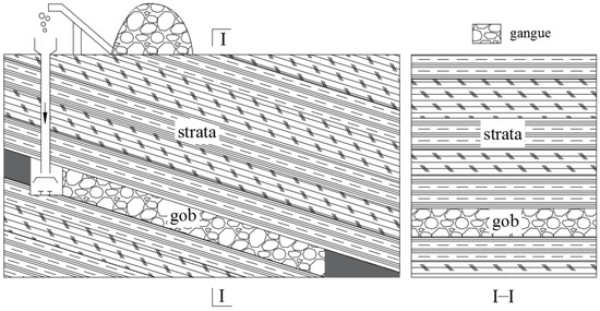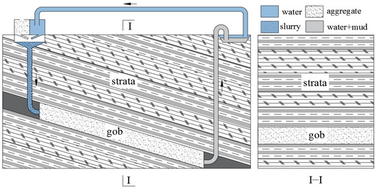 Hydraulic backfill mining is the earliest backfill mining method that is largely employed in Chinese underground coal mining, as shown in Figure 4. This backfill mining method was first proposed in America for the purpose of protecting a church located above an underground coal mine. After, this mining method was introduced in Europe, and it was especially largely popularized in Poland. As of 1960, Chinese mining engineers started to import this mining method to extract metallic mineral resources, and the backfill material mainly consisted of powdery tailings from solid ore milling operations [17]. It has been found that this mining method can effectively limit the overburden strata’s movement. Shortly afterward, hydraulic backfill mining was successfully employed to extract underground coal resources in cases where villages were located above. As shown in Figure 4, solid aggregate is first mixed with water, the slurried material then flows into the underground gob space and, finally, the water is exuded from the hydraulic fill; the solid aggregate left in the gob can fill the excavations and limit the potential movement of the overburden strata. The water that exudes from the gob has to be pumped up to the water sump at ground surface, where the mud in the dirty water will be removed through a precipitation process, and the clean water can be reused in the next backfilling cycle.