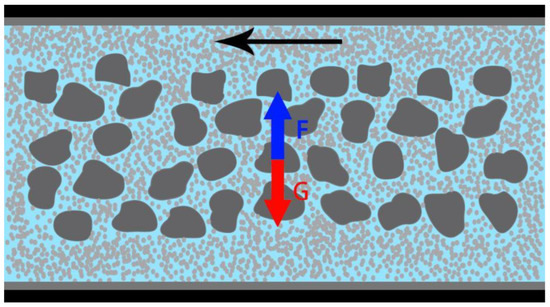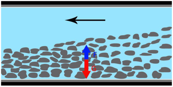The hydraulic backfill material (i.e., solid aggregate) is mixed with water and, thus, floats in the slurry, resulting from the buoyancy force of the water before transportation. At the same time, the solid aggregate in the slurry also sinks toward the pipe shell due to the fact of its own gravity. As a consequence, the solid aggregate will settle during transportation and can only move a certain distance with the flowing water, as shown in Figure 5. Apparently, the transportation distance of the solid aggregate during hydraulic backfilling mainly depends on the amount of time that the solid aggregate takes while maintaining a floating state in the slurry. Unfortunately, the suspension time of the solid aggregate in water is always limited, because the downward gravitational force imposed on the solid aggregate is much larger than the upward buoyancy force on them due to the fact that the density and size of the solid aggregate in hydraulic backfilling are always large [19]. The fluid mechanics equation of the solid aggregate during hydraulic transportation is as follows: