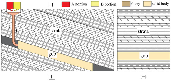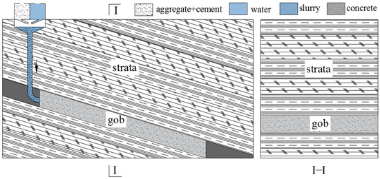 Cemented backfill mining is the second backfill mining method that is largely employed in Chinese underground coal mining, as shown in Figure 7. The most significant improvements in the cemented backfill material compared with the hydraulic one is that the slurry concentration is increased and the water bleeding time is shortened by introducing a cementing agent [8,28]. Cemented backfill mining was first proposed in Austria and Canada to replace the previous hydraulic backfill mining [29,30]. In the 1970s, this modified backfill mining method was introduced in China, and it was similarly applied in underground coal mines after the practices in metal mines achieved success [31]. After, the concentration of the cemented backfill material continually increased to improve the material’s flow property and consolidation strength. In 2006, a modified cemented backfill material, a pasty slurry, was tested in a Taiping coal mine, indicating that cemented backfill mining in China has entered a new advanced stage [32]. Practice indicates that this modified backfill material’s performance has obvious advantages, including high efficiency during the transportation stage and large bearing strength during the activation stage [33,34,35]. Most importantly, the water constituent added during the slurried material preparation stage can react with the cementing agents during the activation period in the gob and, thus, no surplus water exudes out from the gob space [8,36]. Therefore, costs for the drainage of the water and fine particles can be saved, the backfill mining speed can be accelerated, the gob space can be fully filled and the control effect on the overburden strata can be guaranteed as well [37,38,39].
