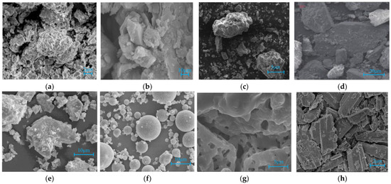 SEM images of the cemented backfill material [37,47,48,49,50]: (a) coal gangue magnified by 5000×; (b) limestone magnified by 4000×; (c) tailings magnified by 5000×; (d) river sand magnified by 4000×; (e) magnified Portland cement; (f) magnified coal ash; (g) magnified lime; (h) magnified gypsum.