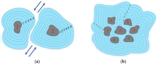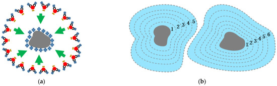 According to Coulomb’s law, the electric field intensity is inversely proportional to the square of the distance. Therefore, water molecules close to the microparticle’s surface are strongly attracted by electrostatic force. As the distance increases, the attraction force decreases. The bound water formed on the surface of particles can be divided into strongly bound water located at the inner layer and weakly bound water located at the outer layer. Therefore, after intense agitation, good contact between the microparticles and water molecules is achieved, and a large number of water molecules will be adsorbed on the surface of the microparticles, forming multilayer water films, as shown in Figure 10b. The particles have stronger adsorption on the nearby water film and do not easily break away from the bondage of the particles. However, the water film that is far away from the microparticles easily escapes from this bondage due to the fact of its relatively weak adsorption capacity. In addition, the existence of water film increases the volume of the microparticle equally, thus further increasing the buoyancy force of the microparticles [63]. On the other hand, due to the existence of water film on the surface of the microparticle, the proportion of bound water is increased, the proportion of free water is reduced and the utilization efficiency of the water is improved.