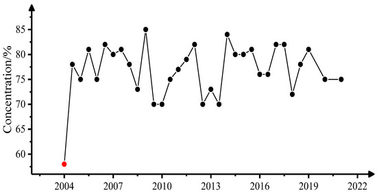 Variation trend in the concentration of the cemented filling slurry over the years. The red dots indicate that the concentration of the cemented filling slurry has not been reached since the previous time, while the black dots indicate that the concentration of cemented filling slurry has been reached later in time.