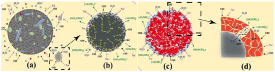 Reaction process and hydration product formation mechanism of low-calcium fly ash stimulated by alkali [37]: (a) dissolution stage; (b) depolymerization stage; (c) polycondensation and polymer gel stage; (d) diffusion stage.