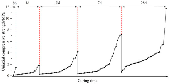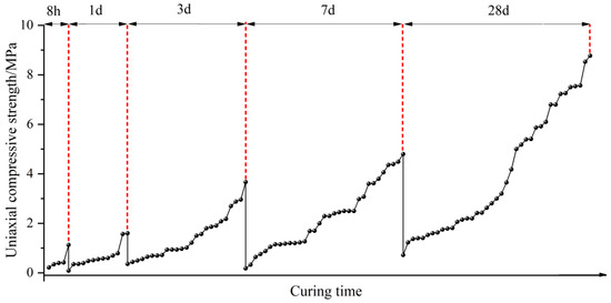 Compared with water–sand filling material, the bearing strength of cemented filling material is greatly improved and the overburden control effect is significantly improved due to the introduction of cement. The type and amount of cementing agents directly affect the performance of this kind of backfill material [69]. In underground coal mining, Portland cement, coal ash, gypsum and lime are commonly employed to bond aggregates of different particle sizes together through a hydration reaction to generate backfill masses with a certain strength. In tests, the curing time of the cemented paste mixture was determined, which was carried out in accordance with the standard using the Vicat apparatus [70,71]. In the tests, a measurement of the penetration depth of a steel needle with a diameter of 1 mm was taken under a specific weight of the moving part of the apparatus. The tests were completed when the steel needle was submerged to a depth of less than 3 mm [72].