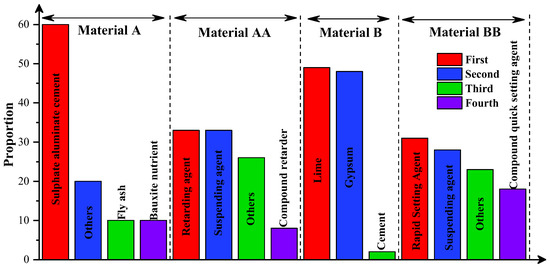 The cemented backfill materials used in underground coalmines commonly consist of water, cementing agents and coarse and fine aggregates, and the percentages of each are illustrated in Figure 8. The solid coarse aggregates are usually composed of cracked gangue, solid construction waste and gravels; the solid fine aggregates are mainly composed of coal gangue, tailings and sand (river sand and aeolian sand) and the cementing agents are mainly made from coal ash, Portland cement, gypsum and lime. It should be noted that the majority of the water added during the preparation stage not only plays a role in reducing the transportation resistance by floating the solid aggregate away from the pipeline’s wall but also increases the final consolidation strength in the gob through a chemical reaction with the cementing agent [40,41,42].
