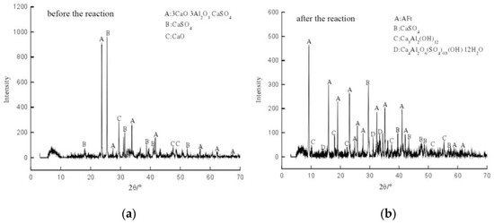 As shown in Table 1, the hydration reactions of mineral components in cement are as follows: The content of tricalcium silicate (C3S) in cement clinker generally accounts for approximately 50%, sometimes up to 60% or more. Therefore, the hydration products of C3S and the corresponding structure formed determine the performance of the cemented backfill mass, and the corresponding reaction is shown in Equation (8). The hydration rate of dicalcium silicate (C2S) is very slow, which is approximately 1/20 that of tricalcium silicate, and its reaction is shown in Equation (9). The hydration reaction of tricalcium aluminate (C3A) is rapid, and the composition and structure of its hydration products are greatly affected by the concentration and temperature of calcium oxide and alumina in solution, and the reaction at room temperature is shown in Equation (10). When the liquid calcium oxide concentration reaches saturation, the reaction of tricalcium aluminate (C3A) is shown in Equation (11), and the product C4A13 exists stably and increases in quantity under alkaline conditions, which is the main reason for the rapid solidification of cement. In the presence of gypsum and calcium oxide, tricalcium aluminate (C3A) rapidly hydrates into C4AH13 at the beginning, which then reacts with gypsum to form ettringite (AFt), as shown in Equation (12). When the gypsum is exhausted, the C4AH13 formed by hydration of tricalcium aluminate (C3A) can react with the ettringite previously formed (AFt) according to Equation (13) to form calcium sulphoaluminate hydrate (AFm). When the amount of gypsum added is very small, there may still be tricalcium aluminate (C3A) unhydrated after all of the ettringite (AFt) has been converted to monosulphide calcium sulphoaluminate (AFm). In this case, a solid solution of C4ASH12 and C4AH13 is formed according to Equation (14). The hydration products of tricalcium aluminate (C3A) are varied according to the gypsum content. The hydration reaction of tetracalcium ferroaluminate (C4AF) and its products are very similar to those(that) of (C3A), resulting in a solid solution of calcium sulphoaluminate hydrate (AFm) and calcium sulfur ferrate hydrate, as shown in Equation (15) [26,53,69,73], and the SEM profile of the different mineral components are shown in Figure 14.
