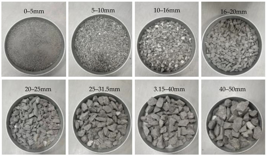 The hydraulic backfill material selected for underground coal mining is always composed of water and solid aggregate, including gangue, sands, gravel and other solid construction wastes. It should be noted that the main purpose of water during the preparation process is to make the material flowable to facilitate the following transportation operation. The addition of water in the backfill material acts like a “carrier” for the solid aggregate and does not react with the solid aggregate. The solid aggregate is the main load-bearing structure of the backfill material, and the grain size and grading type have to be taken into consideration during the preparation process to ensure that the hydraulic backfill material is sufficiently fluxible in the pipeline during the transportation stage and to provide it with sufficient strength in the gob space during the activation stage [18].