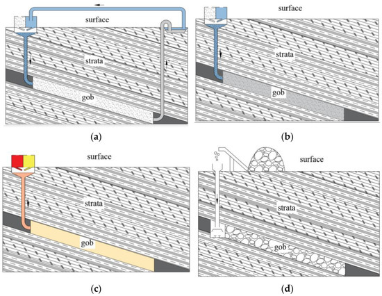 Backfill mining is the most effective approach for realizing the green mining of underground coal resources. Longwall mining has become the most common underground coal-mining method in China in recent decades due to its optimal performances in large productivity and high efficiency [7]. Experience indicates that the major concerns of an underground longwall mining disturbance are the extent of the surface subsidence and the resulting surface structural damage; breakage of the water-bearing strata, ground and water recession; the appearance of cracks in the surrounding rock and triggered gas release, since there is a complete extraction of the coal in a longwall panel, as shown in Figure 2a. In dealing with coal resources under special conditions where a large surface subsidence is not allowed, such as in construction, railways and water bodies, conventional longwall mining will not qualify. Partial mining methods, including room and pillar mining, strip mining and limited thickness mining, were designed to extract the underground coal seam under the aforesaid special conditions, as shown in Figure 2b. When the movement of the overburden strata is limited through considerable coal pillar support, coal resource recovery decreases immediately, and stress concentrations, such as gas outbursts, and mine fire hazards are caused indirectly. In order to eliminate the risks associated with these conventional mining methods and to also increase the coal recovery, backfill mining was selected as the most appropriate choice, as shown in Figure 2c. On the one hand, the gob space can be filled with the backfill material, thereby limiting the overburden strata movement to within an acceptable level [8]. On the other hand, the coal pillar left for supporting the overburden strata in the partial mining could be replaced completely by the backfill mass and, consequently, the recovery of coal resources can be maximized [9]. Furthermore, the coal gangue originally causing air pollution and farmland occupation could be backfilled in the gob [10]. As a result, the majority of the risks resulting from underground coal mining can be perfectly resolved. At the same time, backfill technologies are perfect for the placement of waste, which is a desirable phenomenon for environmental reasons. Korzeniowski et al., focusing on the increasing amount of waste residue generated by municipal solid waste incineration (MSWI), carried out a large number of attempts to fill the goaf [11]. Skrzypkowski et al. added flue gas treatment solid waste and fly ash to backfill materials to explore the compressibility of backfill [12].