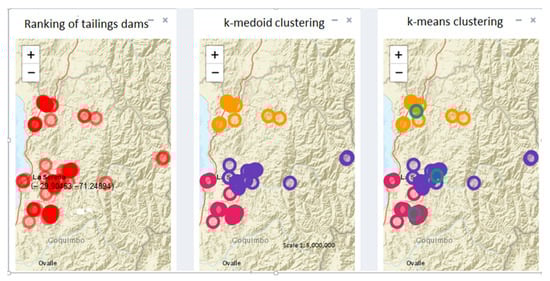 The work presented in this article deals with the prioritization of tailings deposits for intervention planning with economic purpose. However, it should be noted that this research is part of a more holistic approach. This approach proposes a hierarchical method that is divided into three sequential phases. Phase 1 deals with the model for prioritizing tailings dams (proposed in this work), and Phases 2 and 3 address the locations of the plants in relation to the storage facilities. Due to the large number of nodes, Phases 2 and 3 employ data mining techniques that use the k-medoids and k-means clustering algorithms, respectively. The results and details about the location algorithms, k-medoids and k-means, are reported in previous work by [23,24]. This paper explains Phase 1 in the application of a multicriteria decision-making model that is solved by the Promethee method. Figure 1 shows the types of results of the three phases. On the left, the figure shows the most attractive dams for commercial value in a darker color; in the center, clusters by localities are shown in different infilled colors; finally, on the right, the hub location for each cluster is shown in cyan circles. The connection between Phase 1 on one hand and Phases 2 and 3 on the other is that the distances used in the data mining methods are weighted by the scaled weights obtained from the Phase 1 multi-criteria model.