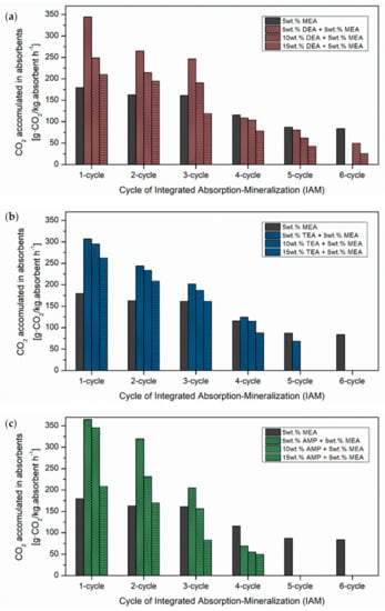 The selection of appropriate blended alkanolamine absorbents for operating multicycle IAM is crucial in maximizing the benefits of high CO2 absorption and conversion per operation time, low degradation rate, low toxicity, and cost efficiency. Among various alkanolamine blends, the addition of 15 wt.% AMP to a constant 5 wt.% MEA showed the highest composite index (Table S1), resulting in the highest CO2 absorption rate of 153.93 g·CO2/kg.absorbent h−1 and carbonate production rate of 134.04 g.carbonate/kg.absorbent h−1 over a relatively short overall operation time of 43.17 min at the end of the multicycle. This blended absorbent exhibited a low degree of degradation at 45.12% and a high CO2 conversion efficiency of 87.08%, which were the main focus of this study.