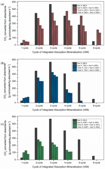 Figure 3 presents the amount of generated insolvable carbonates from the blended alkanolamine absorbents in the unit of grams of carbonate mixture per kilogram of blended absorbent per unit time. The results of the single 5 wt.% MEA absorbent served as references (gray columns) []. The investigation of the CO2 conversion in multicycle IAM utilizing single and blended alkanolamine absorbents demonstrated that the trend of carbonate generation was consistent over time. The initial yield of CO2 conversion was low, as a portion of the absorbed CO2 molecules bonded with the amino groups in the amine absorbent during cycle 1. However, the addition of waste brine resulted in an increase in solid carbonate generation, leading to a corresponding improvement in the CO2 conversion in subsequent cycles [,].