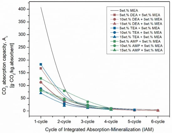 Herein, we used an alkanolamine blend containing DEA, TEA, and AMP components in MEA absorbents in multicycle IAM to enhance the CO2 absorption capacity and rate, conversion efficiency, absorbent degradation, and operation time. The blended alkanolamine absorbents were evaluated in comparison to the single MEA as a reference absorbent under multicycle IAM conditions, considering the different blending components and concentrations [].