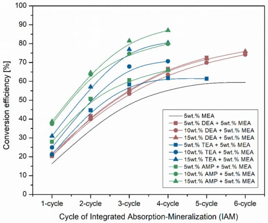 The performance of multicycle IAM can be effectively evaluated by examining the CO2 conversion, which represents the amount of absorbed CO2 that can be converted into precipitated carbonates (Table 1). The CO2 conversion from the alkanolamine absorbents is calculated as the conversion efficiency [] using Equation (8).