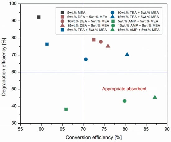 Figure 5 presents the degradation efficiency of each blended alkanolamine absorbent during the IAM cycle. A degradation ability of an absorbent approaching 100% means that the capacity to absorb CO2 has been eliminated. Therefore, an absorbent that can be used in the IAM cycle more than once should demonstrate little degradation after the first cycle.