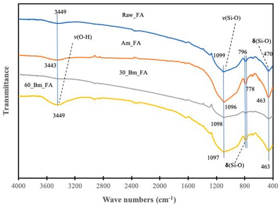 The FTIR spectra (Figure 2) of the milled samples show absorption bands centered at 463–470, 778–796, 1096–1099, and around 3449 cm−1; these retain a similar shape and position irrespective of the milling treatment. This suggests that milling does not change the bonding state of the raw fly ash. The spectra of the fly ash sample ball milled for 60 min show an increased intensity in the bands of adsorbed water molecules at 1630 (the bending mode) and 3449 cm−1 (the OH-stretching modes). The stretching and bending modes of the Si-O bond are shown in Figure 2.