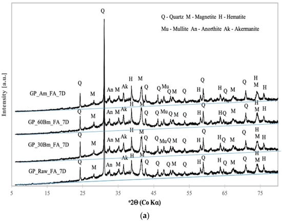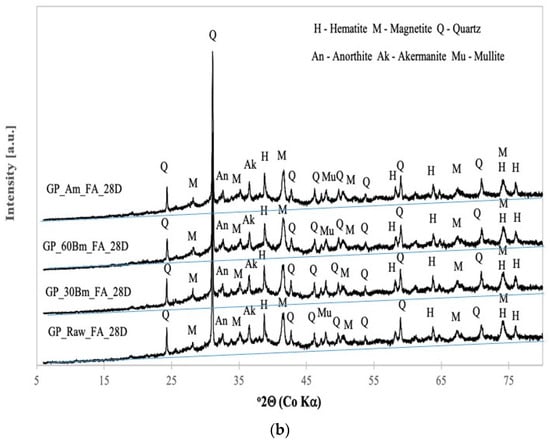Figure 4a,b show the XRD patterns of the geopolymer pastes cured for 7 and 28 days. The XRD patterns of the cured samples resemble those of the raw and milled fly ash starting materials, with no apparent change in the crystalline components resulting from the alkaline treatment. This suggests that the geopolymer-forming reactions occur principally in the amorphous component of the fly ash, with negligible participation of the crystalline components. In contrast with previous work on geopolymer formation from ash from the fourth thermal power plant of Ulaanbaatar city [20], zeolite formation was not observed in the cured products. This may be related to the low curing temperature of the present samples (40 °C) where the dissolution rate of the fly ash is low. Using the baselines shown in Figure 4, the integration of the total intensity with respect to the diffracted peak intensity indicates that between 37 and 45% of the diffraction patterns is related to the amorphous contribution, i.e., this represents a small change in the amorphous content. On the other hand, a small but significant shift in the scattered intensity from lower 2° theta values (say from 20° to 30°) to higher 2° theta values (30° to 40°) is observed when calculating the difference patterns of the raw and milled samples minus those of the related alkali-activated samples. As a cross check, the difference pattern of the milled pattern does not show this effect. A related but more pronounced observation is discussed below in connection with the FTIR absorption spectra (Figure 5a,b).
