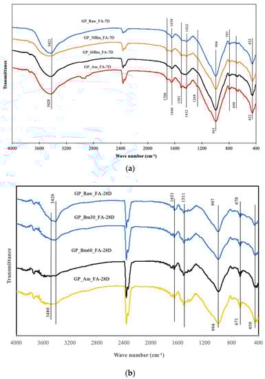 Figure 5a,b show the FTIR spectra of the geopolymer pastes cured for 7 and 28 days. The FTIR spectra contain absorption bands of similar shape and position, which differ significantly from the spectra of the raw and milled fly ash samples (Figure 2). The peak maxima of the main absorption bands of the geopolymer samples are at about 993–998 cm−1 and 450–452 cm−1 and are lower than those of the fly ash samples by about 100 and 15 cm−1, respectively. There are only slight deviations between the geopolymer samples cured for 7 and 28 days, taking into account the possibility of experimental uncertainties introduced by atmospheric conditions for referencing and sampling (e.g., the effect of the atmospheric CO2 contribution at 2400 cm−1). However, it is clear that the absorption peaks in the range of 1400–1520 cm−1 are due to (CO3)2− formed on exposure of the NaOH solution to atmospheric CO2. Moreover, the absorption bands at about 3420 and 3480 cm−1 and those at 1650 cm−1 (in the 28-day sample) and 1638, 1646, and 1708 cm−1 (in the 7-day sample) are related to the stretching and bending vibrations of the H2O molecules, respectively. These H2O molecules are formed by the polycondensation reactions and become enclosed in the geopolymer network. The concentration of these species is much larger in comparison with the surface-adsorbed H2O species, as seen in the sample ball-milled for 60 min (Figure 2).