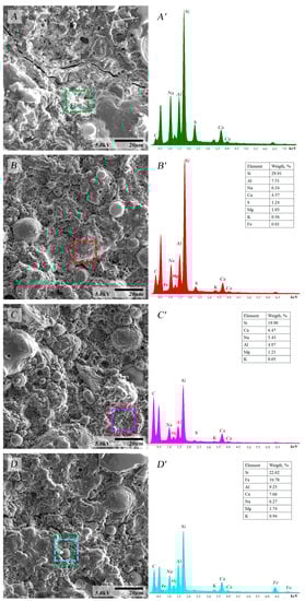 SEM micrographs and the corresponding EDS spectra of the raw and milled fly-ash-based geopolymers after 28 days of curing. (A,A’) Raw. (B,B’) Ball-milled 30 min. (C,C’) Ball-milled 60 min. (D,D’) Attrition-milled.