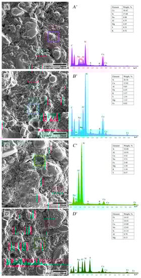 SEM micrographs and the corresponding EDS spectra of the raw and milled fly-ash-based geopolymers after 7 days of curing. (A,A’) Raw. (B,B’) Ball-milled 30 min. (C,C’) Ball-milled 60 min. (D,D’) Attrition-milled.