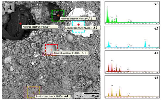In these samples, the fly ash particles are typical aluminosilicates with a partially dissolved surface layer (A3). Unburned carbon was also detected in the EDS spectrum (A1). An interesting feature of the attrition-milled fly ash geopolymer is the appearance of a geopolymeric product with a discrete gel-type structure (Figure 7D,D’ and Figure 8(A4)). Although these geopolymer products appear similar, they differ in chemical composition. Figure 7D represents the typical geopolymer composition containing Al, Si, Ca, Na, and S atoms, whereas Figure 7D’ contains Ca, Na, Si, and S atoms. The latter may represent a non-geopolymer product containing sodium silicate NS and calcium silicate hydrate CSH. The XRD, FTIR, and SEM-EDS analyses suggest the formation of amorphous geopolymer and calcium silicate phases, regardless of the milling conditions in all the fly-ash-based geopolymer samples, together with sodium silicate and calcium silicate in the attrition-milled fly-ash-based sample.
