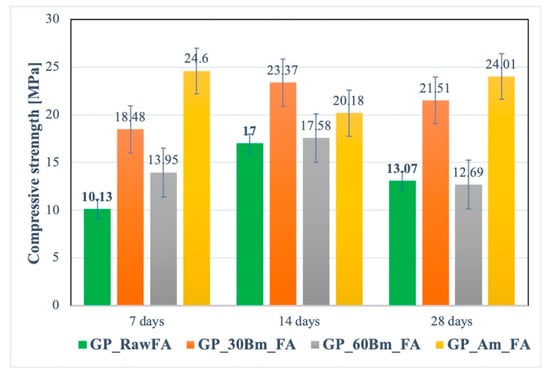 Figure 9 and Figure 10 show that in general the compressive strengths correlate with the bulk densities of the geopolymers. We also suggest that the principal influence on geopolymerization is the granulometry of the milled fly ash rather than the method of mechanical amorphization. Thus, it is likely that the solubility and dissolution reactions in the milled fly ashes depend on their mineralogical composition and granulometry. We also suggest that the milling process promotes the pozzolanic reaction responsible for the formation of the CSH gel phase, as usually occurs in mechanically activated fly-ash-containing binder systems [23].