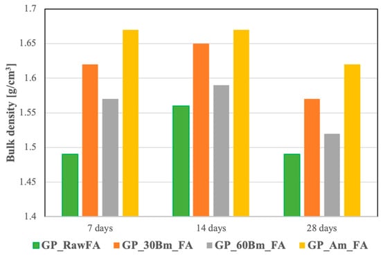 The results of the compressive strength (CS) and bulk density (BD) measurements of the geopolymers are shown as bar diagrams in Figure 9 and Figure 10, respectively. The highest CS value (Figure 9) at all curing times except 14 days is found in the attrition-milled geopolymers, whereas the next highest CS value for the overall samples is found in the geopolymer sample formed from fly ash ball-milled for 30 min, although the values for these samples are in agreement within the limits of error of these measurements (Figure 9). The attrition-milled samples show the highest values of bulk density at all curing times, followed by the samples ball-milled for 30 min (Figure 10).
