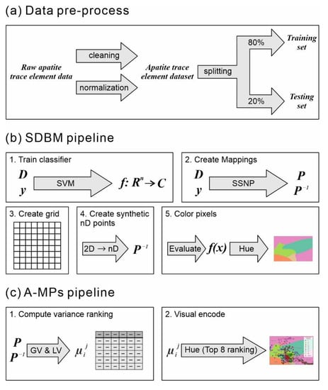 Data process workflow. (a) Data pre-process. (b) SDBM pipeline (after []). y is labels of the dataset as the genetic types of apatite. f(x) is evaluation metrics of accuracy and f1 score. The generated colored diagram is SDBM (The clear SDBM is shown in Figure 2. The remaining parameters are described in the text. (c) A-MPs pipeline. The generated colored diagram is visual encoding of A-MPs (The clear plot is shown in Figure 3).
