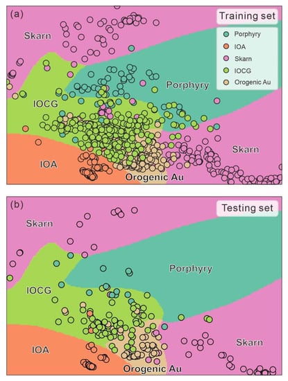 The proximities of the samples to the closest decision boundaries represent the confidence of classification, while they are directly proportional to uncertainties. Apatite samples from the porphyry deposit are plotted near the boundary between the IOCG and porphyry deposit. Therefore, the confidence of the predicted porphyry label was relatively low, although it was well clustered (Figure 2a). Figure 2b shows that most apatite samples from the porphyry deposit in the testing set fell near the boundary. The low confidence may be mainly attributed to the complexity of porphyry mineralization processes. Because of porphyry, mineralization spanned a broad temperature range from 250 to 1000 °C; therefore, apatite crystallize in different stages of porphyry deposit may have quite different trace element signatures [,,]. Apatite from the IOCG deposit is also plotted near the boundary between the IOCG and orogenic Au deposit, which also explains its low accuracy.