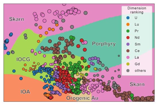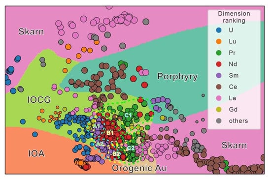 Based on the A-MPs approach, we computed the ranks of all of the dimension points and generated a visual interpretation of the SDBM diagram. All samples were colored according to the dimension (element) that contributed the most (Figure 3). The top seven dimensions that affected the clustering performance were U, Lu, Pr, Nd, Sm, Ce, and La. Most analyses clustered well on different dimensions. Eu contributed the most to the good clustering of the porphyry deposit samples after projection, and the concentration of Eu of the apatite sample in the porphyry deposit showed a high similarity. For the IOA deposit samples that performed well in the SDBM diagram, they were not controlled by one element actually, but Lu, Sm, and U simultaneously contributed the most to distinguishing IOA deposit. Samples from IOCG and orogenic Au deposit were controlled by Pr, Nd, and Sm simultaneously, which were not well distinguished.