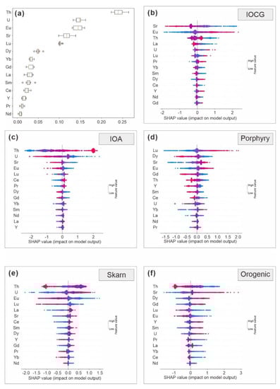 Feature importance is a model inspection technique. After a single feature in the test dataset was shuffled, the test data were reclassified. If the test score dropped, it indicated that the model depended on this feature to a great extent. Depending on how much the model performance declined, the features were listed in order from highest to lowest to find out the most effective feature for the classification []. Figure 5a shows that Th, U, Eu, Sr, and Lu were the most effective elements for distinguishing the ore genetic type. However, it is not clear how these five elements affected the classification and whether they had a positive or negative impact on the classification.