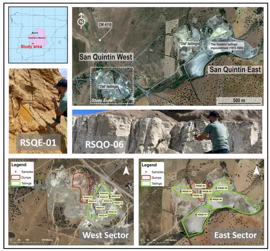 This mining district is formed by a large number of mines distributed along the southwest area of Ciudad Real province. In particular, SQMG represents the largest one and comprises two mining zones (Figure 1) delimited and separated by 800 m: San Quintín East (affecting an area of 12 Ha) and San Quintín West (affecting an area of 40 Ha) [13].