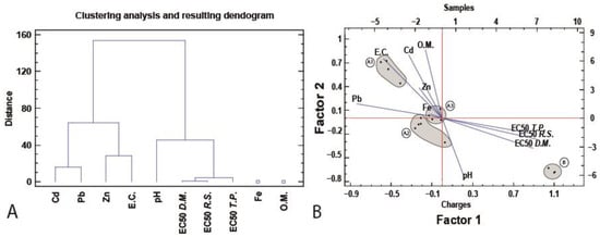 (A): Cluster and factor analysis for the studied samples. The lines correspond to the punctuations for the first and second factors of the considered values. (B): Principal component analysis (PCA) for the PTE, bioassays values, pH, EC and OM. Groups in the factor analysis graph were obtained in the cluster analysis.
