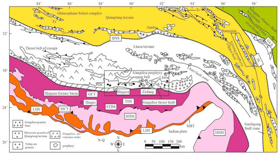 A sketch of the geological background of the East Tethys–Himalayan tectonic belt and the location of the Gondwanan orogenic belt [28,29]. (Ts, tertiary sedimentary rocks; THS, Tethys–Himalayan sedimentary sequence; HHM, high Himalayan metamorphic system; LHS, low Himalayan metasedimentary sequence; IYS, Indus–Yarlung Tsangpo suture zone; BNS, Bengong Lake—Nujiang suture zone; JS, Jinsha River suture zone; AKMS, Animachin–Kunlun–Muzetag suture zone; GLS, Ganzi–Litang suture zone; STDS, Southern Tibetan dissociation system; MCT, main central retrograde fault; MBT, main boundary retrograde fault; GCT, Gondes central retrograde).