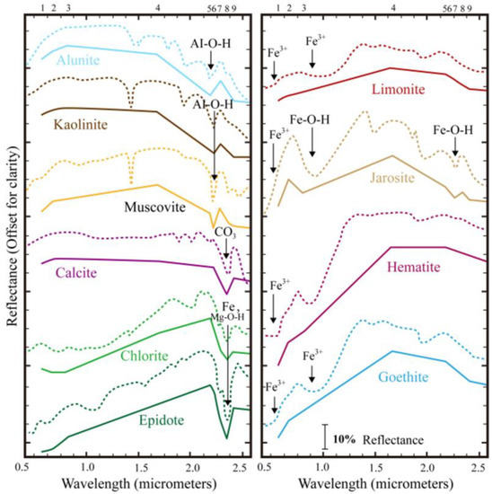 At this stage, the mineralization alterations that can be identified using multi-spectral remote sensing data are mainly iron staining anomalies and hydroxyl anomalies [30]. The iron staining anomaly reflects the richness of hematite, limonite, and yellow potassium iron oxide in the striatum. The hydroxyl anomaly demonstrates the presence of hydroxyl-bearing minerals, such as kaolinite, sericite, chlorite, and chlorite, in the strata. Using ASTER data in multiple bands in the infrared spectral range further distinguishes aluminum hydroxyl minerals, such as kaolinite, from magnesium hydroxyl minerals, such as chlorite and calcite [31,32,33]. As mineral spectra may vary slightly from region to region, to gain a more accurate understanding of the spectral distribution of the three alteration minerals in the Gondwana region, the laboratory spectra of iron oxide minerals, aluminum hydroxyl minerals, and magnesium hydroxyl minerals were obtained by applying infrared spectroscopy to the minerals in the study area to remove spurious peak interference, based on the United States Geological Survey (USGS) wave spectral database for mineral resource development (Figure 2).