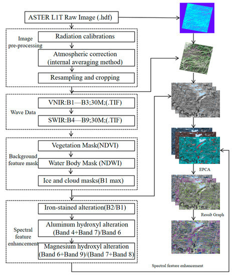 ASTER data pre-processing and spectral feature enhancement methodological flow chart.