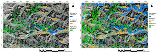 However, it was also found in the study that ASTER multispectral images still need improvement in the identification of homogeneous and heterogeneous minerals, and the future work should optimize the degree of mineral classification and improve the reliability of the results by trying to refine the means of mineral identification with hyperspectral images. In addition, future studies should combine regional mineral alteration information with geophysical and chemical information from a geological perspective. This is of great scientific importance for the in-depth analysis of the distribution of mineralizing elements, the formation process of metal deposits in mineralized zones, and the improvement of porphyry mineralization theory.
