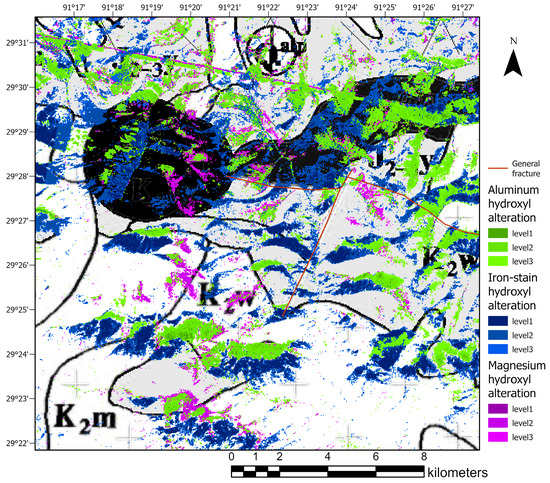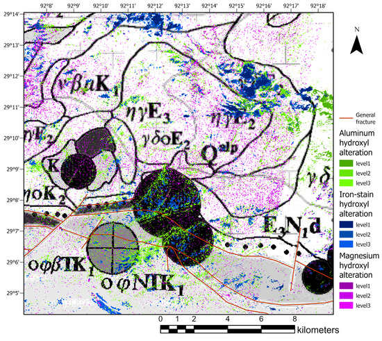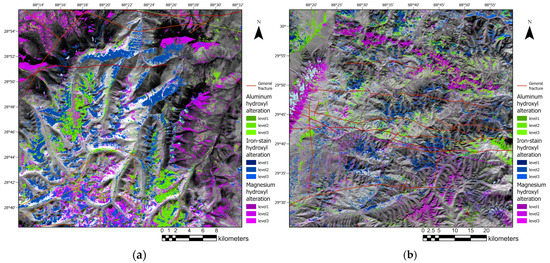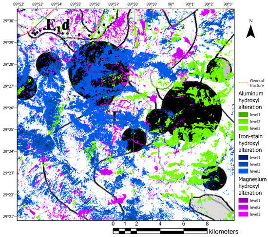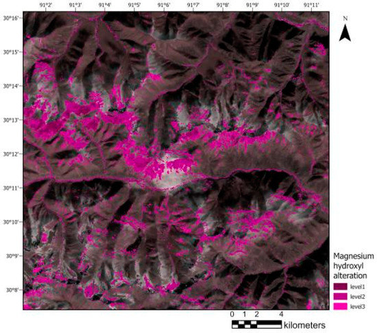 The results obtained by the EPCA method for Fe-stained alteration, Al-hydroxy alteration, and Mg-hydroxy alteration in the study area are classified into three levels of intensity, level 1, level 2, and level 3, respectively. Figure 5, Figure 6, Figure 7, Figure 8, Figure 9 and Figure 10 show the spectral enhancement effects calculated for the three warp bands. Finally, the results are overlaid on the ASTER remote sensing image base map to produce alteration maps, as shown in Figure 11, Figure 12 and Figure 13.