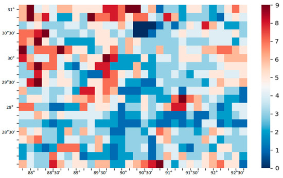 To enhance the spatial aggregation and delineation of metallogenic prospective areas based on the laws mentioned above, we divided the study area into 20 × 30 rectangular blocks using the thermogram concept. We quantified lithology–tectonic alteration multi-source geological information through visual interpretation on a scale of 0–9, totaling ten levels (Figure 19). By combining the thermodynamic map with information on the distribution of erosion in the county zones of the study area, we conducted a comprehensive analysis (Figure 20) and found that the most significant spatial clustering of multi-source geological elements existed in several areas (Figure 21). These areas include the Neoproterozoic porphyry tectonic window in Sakya County, Shigatse City, located in the southwest of the study area (a); the Paleoproterozoic porphyry fracture zone in Xietongmen County, Shigatse City, located in the northwest of the study area (b); the Paleoproterozoic and Paleocene granite porphyry fracture zone in the southern part of the Nyingchi Tanggula Range (c); and the Paleoproterozoic porphyry fracture zone in the eastern part of Lhasa in the central part of the study area (d). These areas can serve as prospective areas for mineralization and provide a theoretical basis for actual exploration and mineralization.