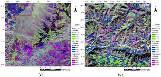 The further comparison of the selected study areas (Figure 4) shows that the alteration results obtained by EPCA are significantly better than those of the traditional Crosta method in terms of spatial aggregation; at the same time, the alteration results are enhanced considerably after spectral enhancement, especially the iron-stained alteration, and the three alteration results extracted by the improved EPCA method can be spatially generalized to a specific aggregation pattern, which can be integrated with multi-source geological elements through geological mineral analysis. The three alteration results extracted by the improved EPCA method can be spatially aggregated. They can be analyzed employing geological-mineralogical analysis and integrated with multi-source geological elements, which has a tremendous advantage for the subsequently incorporated mineralization exploration.