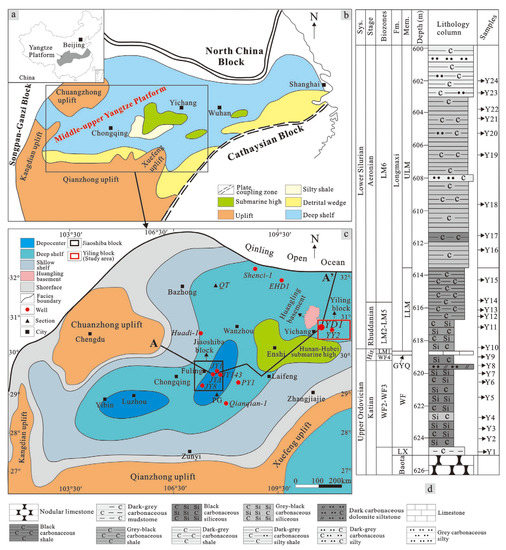 (a) Location of the Yangtze Platform in South China. (b) Palaeogeography of the Yangtze Platform in South China in the early Silurian (simplified from Zhang et al., 2019a [15]). (c) Palaeogeography of the middle-upper Yangtze Platform in the early Silurian showing the study area of the Yiling block in the southeastern Huangling basement (modified from Huang et al., 2020 [16]). (d) Lithostratigraphic column of well YD1 in the Yiling block showing black siliceous rock in the WF, black siliceous rock and argillaceous shales in the LLM are organic-rich shales. Note: LX, WF, GYQ, LLM, and ULM are the abbreviations for the Linxiang, Wufeng, Guanyinqiao, and lower and upper Longmaxi formations, respectively.