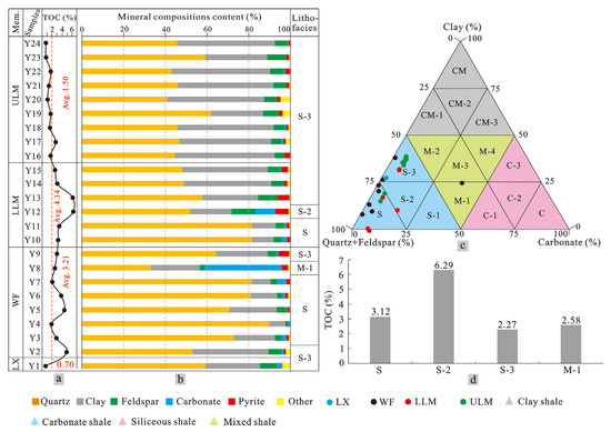 Generally, organic-rich and organic-lean shales are characterized by TOC contents of greater than 2%, and lower than 2%, respectively [51]. The TOC values are presented in Table 1 and Figure 3a. The TOC content is less than 1% in the LX with a value of only 0.7%, and it ranges from 1.90% to 4.94% (avg. 3.21%), 2.61% to 6.29% (avg. 4.14%), and 0.76% to 2.74% (avg. 1.50%) in the WF, LLM, and ULM, respectively. The results show that the WF and LLM include organic-rich shales, and the LX and ULM include organic-lean shales. Additionally, the results show a significant decrease in TOC content from 6.18% of sample Y13 to 3.05% of sample Y14 in the LLM.