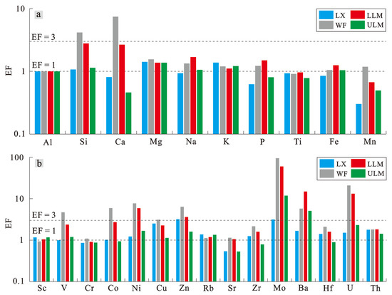where (X/Al)sample is the ratio of element X to Al measured in the sample, and (X/Al)PAAS is the ratio of element X to Al in post Archean Australian shale (PAAS) [33]. Generally, EF > 3, 1 < EF < 3, and EF < 1 were interpreted to reflect apparent enrichment, moderate enrichment, and depletion, respectively, relative to the PAAS standard [34].