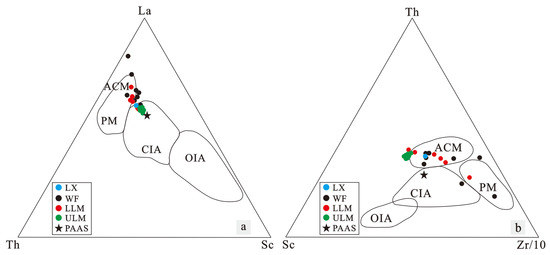 (a) La–Th–Sc and (b) Th–Sc–Zr/10 ternary diagrams (modified from Ge et al., 2019 [38]) showing mainly active continental margin tectonic settings. Note: OIA, CIA, ACM, and PM are the abbreviations for the oceanic island arc, continental island arc, active continental margin, and passive margin, respectively.